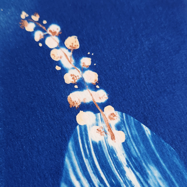 La couleur est peinte à la main à l’encre cuivrée une fois le cyanotype séché et stabilisé.